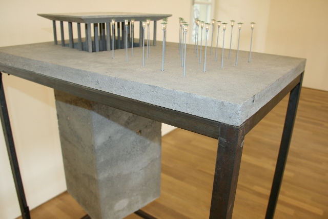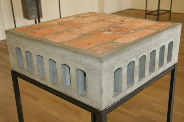 wie Beton, Glas oder Ziegeln bestehen. Die Objekte ruhen auf Metallständern, hängen