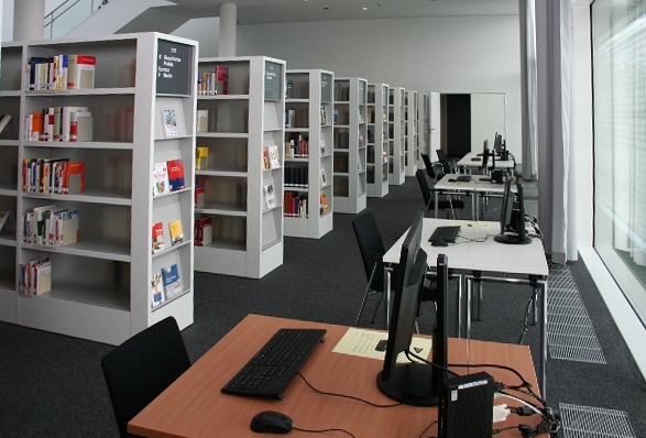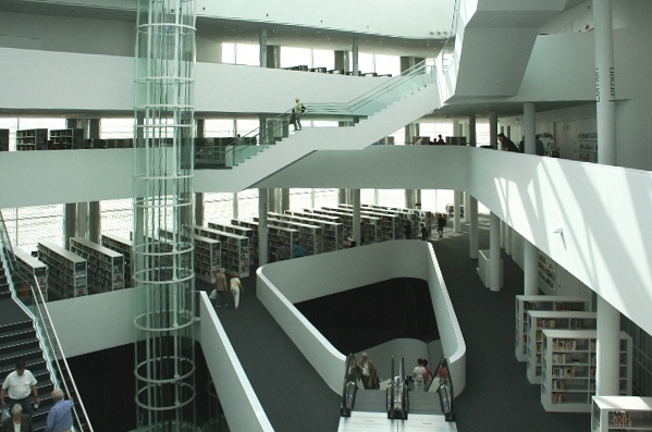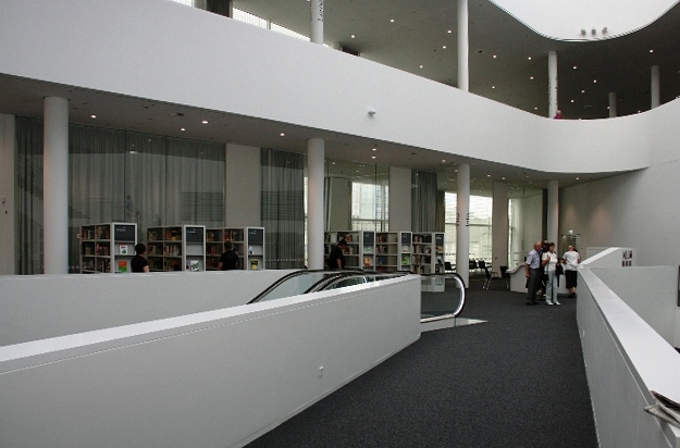 fünften Obergeschoss ist die Stadtbibliothek untergebracht. Der hier durch alle Etagen